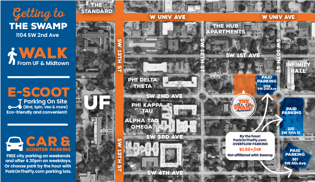 Whether you are walking, riding an e-scooter, Ubering or parking, there are many easy ways to get to our new location. Check out the map for the closest parking options. City parking enforcement is lifted after 4:30pm weekdays and all day on weekends (just be sure to park legally in a spot)— or choose the convenient pay-by-the-hour lots located steps away from the great, new building. These lots are not owned or affiliated with The Swamp, but their owners have provided a great option for people visiting the area. See you soon at Swamp!